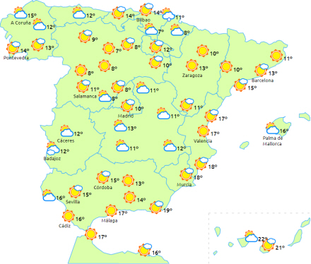 Dagstemperaturerne vil stige på den nordlige tredjedel og i de indre, sydøstlige dele af halvøen. Nattemperaturerne vil falde i Melilla og i halvøens indre egne med let frost i bjergområderne og spredt på den nordlige højslette og den østlige del af den sydlige højslette. Koldest i Pyrenæerne. Kun små ændringer i temperaturerne i resten af landet.