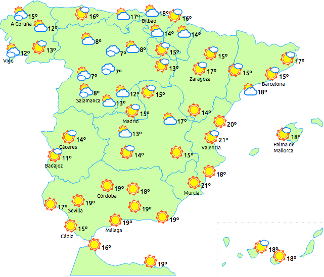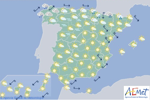 I den helt nordlige del af halvøen er der overskyet himmel med mulighed for svag og spredt nedbør - mest sandsynligt i den østlige ende af den nordlige Atlanterhavskyst og i de vestlige Pyrenæer i dagens anden halvdel.