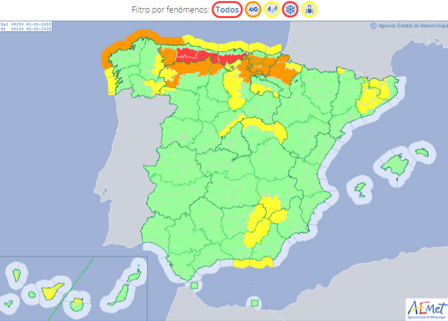 I alt 28 provinser i alarmberedskab - nogle af dem gælder dog først fra senere i dag, og det er blandt andet de røde varsler for sne i Cantabrien og Asturien, og ned til minus syv grader i fastlandets indre egne.