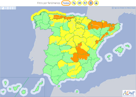Man advarer også om oprørt hav og høje bølger langs den nordlige Atlanterhavskyst og i Almería. Årets første advarsel om lavinefare er også udstedt i dag.