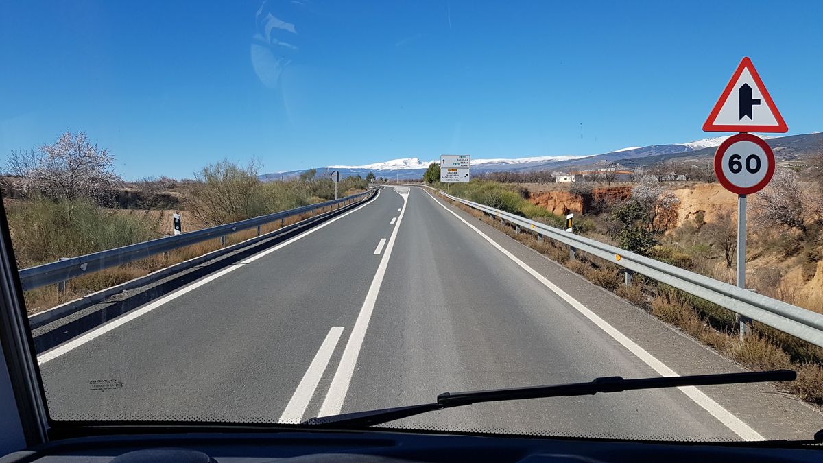 Vi kører højt oppe på bjergsiden for at dykke ned i dalen og op igen. Et barsk landskab. Vi holder ind i Canjayar, for at tømme tanke og få vand på. Videre igen, med sneudsigt. Vi har udset os en lille camperplads ved byen Ugíjar. Vel parkeret, går vi op i byen og finder en restaurant og får ”menu del dia”. Det er håndværker portioner. Så mere end mætte vandrer vi op og ned i byen, så maven kan komme til sig selv. Aftensmaden bliver meget let.......