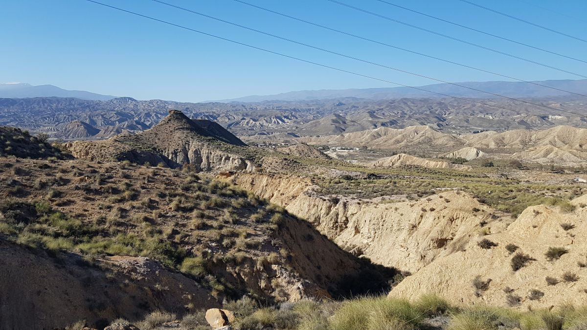Heroppefra er der fantastisk udsigt over det der kaldes Desierto de Tabernas, (24-3)mod Sierra Nevada og meget mere. Og det kan med lidt god vilje, godt ligne landskabet fra det sydlige USA., hvis det ikke lige var for elledningerne på billedet. Tre timer senere er vi nede igen og dagen er ved at være gået.