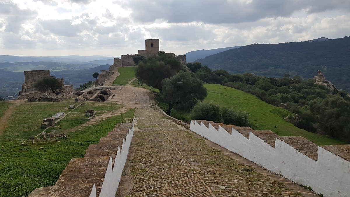 Vi drejer af vej C-3331 som går til Jimena de la Frontera. Og var vejen indtil nu lidt slidt, så er den nu meget slidt. Men med korkege omkring os, afløst af flotte dalstrækninger og utrolig mange skarpe sving, så gør det ikke noget, at farten ligger på 30-40 km i timen når det går godt. Få kilometer før Jimena de la Frontera, får vi en fantastisk udsigt mod Castillo de la Frontera, som vi skal se i morgen.