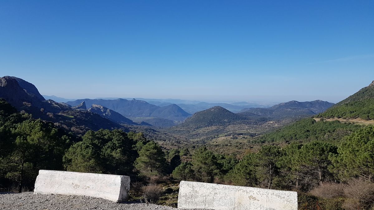 Når vi møder modkørende, så er det ud over den hvide vejsidestribe, for at vi kan passere hinanden. Men et flot og bjergrigt landskab. Ved byen Grazalema holder vi ind på P-pladsen, ved en lille kirke før byen. Og kommer til at holde med snuden af camperen mod øst og med udsigt over hele dalen foran os.