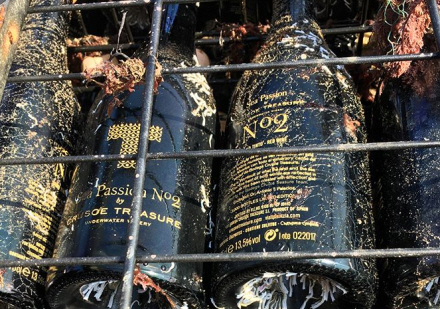 Derefter sænkes flaskerne 20 meter ned under havoverfladen i et stort metalbur. Der bliver de liggende i mellem et halvt og et helt år.