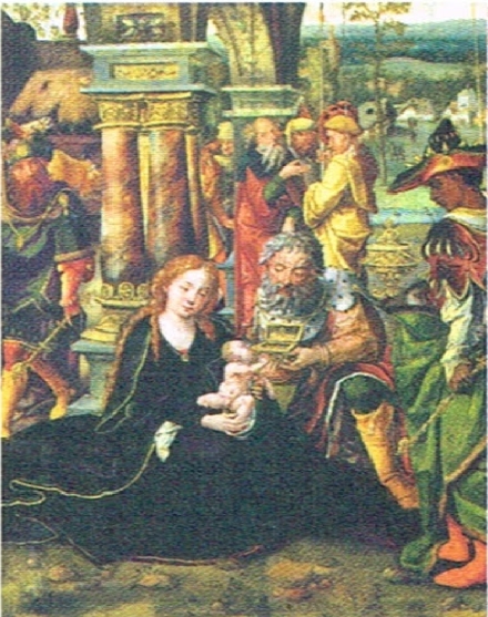 Lodsedlens billede hedder 'Adoración de los Reyes Mayos' – De hellige tre konger beundres – malet af Pieter Coecke i det 16. århundrede. Billedet hænger i Prado Museet i Madrid