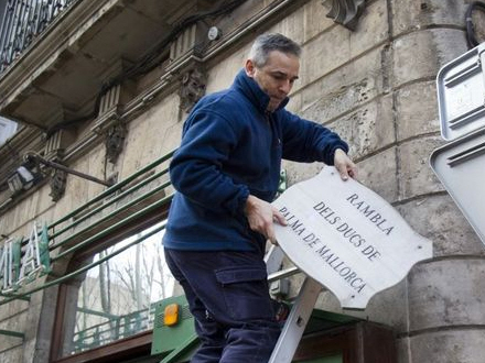 Skiltet med ”Los Duques de Palma de la Rambla” blev pillet ned fredag og erstattet med det tidligere gadeskilt La Rambla. Udskiftningen kommer efter at et flertal i kommunalbestyrelsen i Palma de Mallorca sidste måned besluttede at eliminere prinseparrets navne fra vejskiltet.