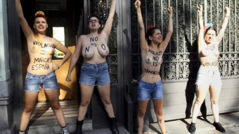 Det blev for meget for fire medlemmer af kvindebevægelsen 'Femen'. Torsdag morgen mødte de topløse op foran indenrigsministeriet med 'voldtægt', 'Spaniens varemærke' og 'stop voldtægten'.