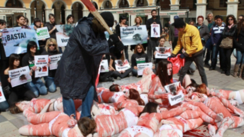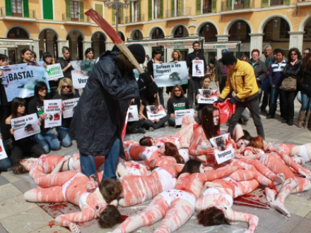 En gruppe unge gennemførte i går en storstilet aktion på Plaza Mayor i Palma de Mallorca i protest mod massedrab af sæl-unger i Terranova i Canada.