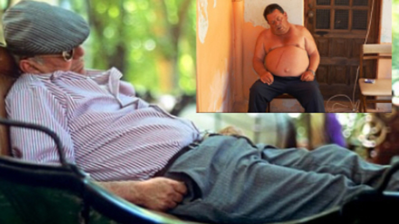 På billedet ser man en overvægtig mand med bar mave, der sidder og sover i en stol. Og på det andet en ældre herre, der tager en lur på sofaen.