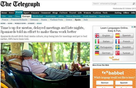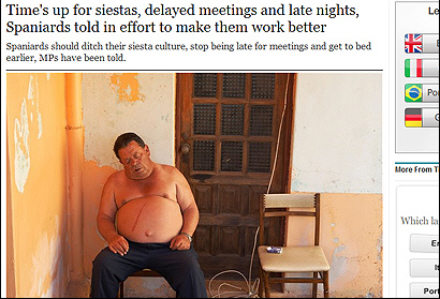 Etorne Samanes har boet og arbejdet i London i otte år og har nu skrevet til The Telegraph for at udtrykke sin misbilligelse over avisens holdning til den spanske siesta. Det har fået avisen til at ændre billedet af den halvfede mand til et stereotypt billede af en andalusisk hestekusk, der lige tager en power-nap i sommervarmen. Hvorvidt det er bedre kan disuteres.