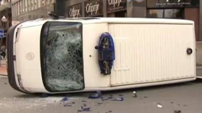 En politibil blev også væltet, da hundredvis af demonstranter råbte ”Troika gå hjem” med hentydning til IMF, Den Europæiske Centralbank og Europa-Kommissionen.