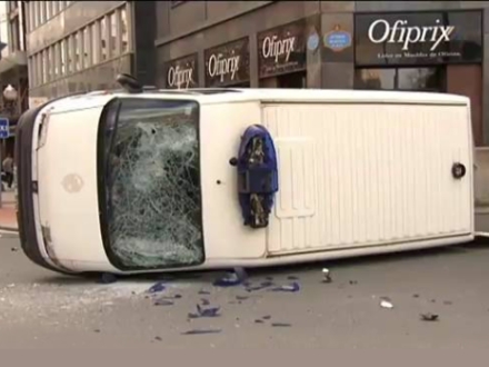 En gruppe maskerede demonstranter markerede deres utilfredshed med den internationale finanspolitik ved at smadre flere butiksvinduer, som især gik ud over stormagasinet El Corte Inglés og tøjkæden Mango, skriver den baskiske avis Diario Vasco.