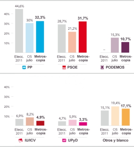 Grafikken viser tallene fra parlamentsvalget, CIS-undersgøgelsen og den seneste Metroscopia