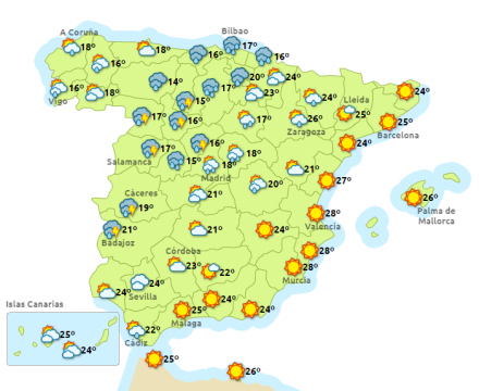 Vejret i Spanien, onsdag klokken 14:00
