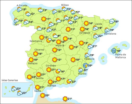 Madrid får i dag letskyet vejr og mellem 9 – 21 grader, Barcelona letskyet 17 – 27, Valencia letskyet 17 – 30 grader og Málaga 16 til 22 grader.