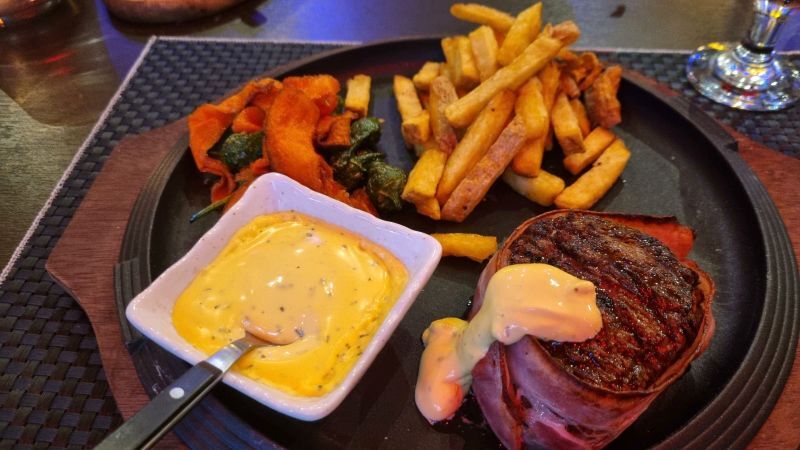 Foruden andre gode stykker kød, så er der en Dagens Special og den valgte Allan og jeg. Det var et stykke tournedos, der var så mørt og veltilberedt at det næsten smeltede på tungen. Dertil bearnaise, håndskårne fritter og de samme lækre gulerodsflager som Svend fik.