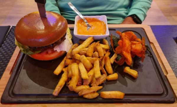 Til hovedret var Svends øjne faldet på en burger. Der er fire forskellige på menukortet og Svend var faldet for den, der hed Black & Blue. En burger med blå ost, der var veltilberedt med tilbehør af håndskårne fritter og lettere krydret mayonnaise. Dertil var der også gulerodsflager, der vistnok var stegte eller bagte. Måske friturestegte. Om det var det ene eller andet, det vil vi ikke lægge hovedet på blokken for, men lækre det var de.