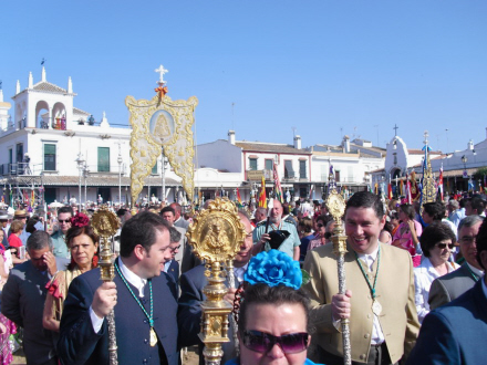 Dagen derpå, pinse søndag, er lige så følelsesladet. De mange tusinde pilgrimsfarende deltager i en gigantisk udendørs messe med biskopen af Huelva. Til højre stavene fra de forskellige broderskaber