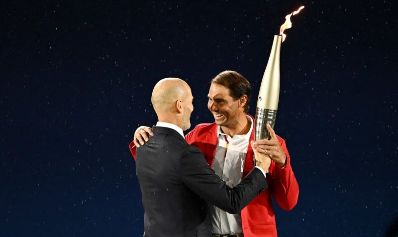Zinedine Zidane overrækker den olympiske ild til a Rafa Nadal