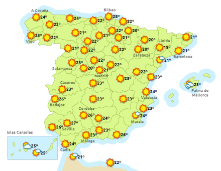Madrid kan sige pænt goddag til solen, som vil skinne fra en skyfri himmel indtil en gang sent på aftenen. Hovedstaden får mellem 11 og 25 grader i dag.