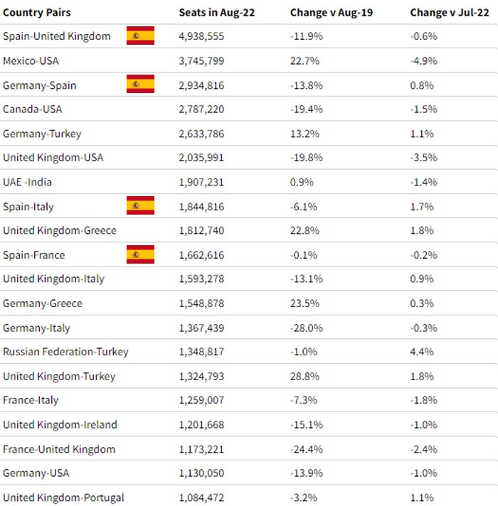 Se også flytrafikken mellem lande, hvor Spanien fører suverænt.
