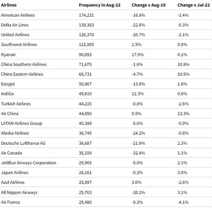 Analysevirksomheden OAG, publicerer hver måned en analyse på baggrund af data over flyselskabernes operationer målt på deres kapacitet. I august lå Ryanair på en femteplads kun overgået af de fire største amerikanske flyselskaber.