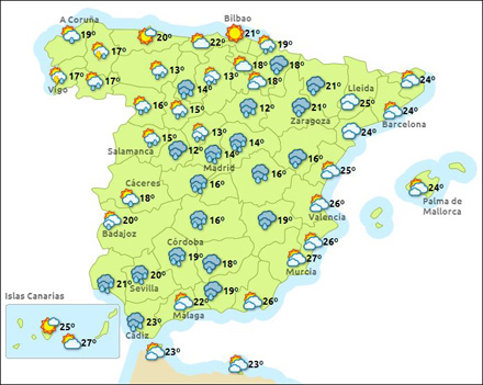 Madrid får i dag byger og mellem 12 – 15 grader, Barcelona letskyet 18 – 25, Valencia letskyet 16 – 25 grader og Málaga letskyet med 18 – 24 grader.