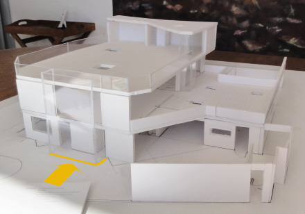 Den gule pil og linjerne viser glasbygningen på modellen for ombygningen