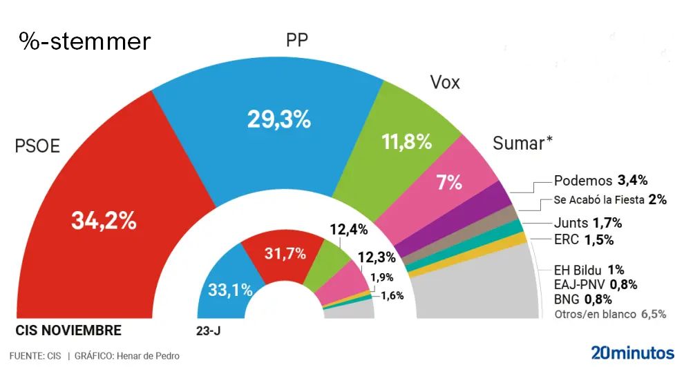 Centret, der ledes af José Félix Tezanos, giver således socialisterne et anslået stemmetal på 34,2 procent, hvis parlamentsvalget blev afholdt i dag, hvilket er 0,2 procentpoint mere end i oktober, mens PPr ville falde to procentpoint til 29,3 procent. Vox ville fastholde det samme estimat med 11,8 procent. Sumar ville genvinde 0,7 procentpoint og Podemos ville stige 0,1 procentpoint til 3,4 procent..