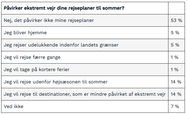 Nogle dropper helt at rejse til udlandet, og i stedet planlægger at rejse i Danmark, dette svarer 5 procent af de adspurgte i undersøgelsen. I undersøgelsen er der desuden 5 procent, som ønsker at blive hjemme, og 7 procent som ikke ved, om det ekstreme vejr påvirker deres rejseadfærd denne sommer. For ca. halvdelen af de adspurgte i undersøgelsen har det ekstreme vejr dog ikke påvirket deres rejseplaner.