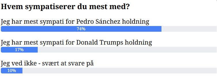 Overordnet var spørgsmålet om læserne sympatiserede mest med Pedro Sánchez holdning om folkeretten og nej til krig, eller Donald Trumps holdning om handelsboykot og NATO-utilfredshed. Alt i køvandet på, at den spanske regering forbød USA at benytte baserne i Spanien til krigsførelsen.