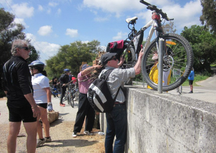 Første forhindring viste sig dog at være adgangen til selve stien, for porten var låst, så vi måtte løfte cyklerne over muren.