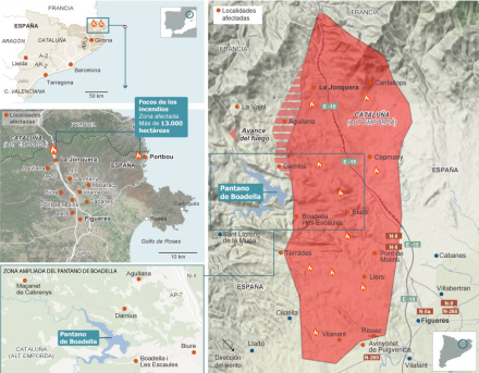 Mens det er lykkedes brandfolk at få bugt med den ene af brandene, breder den anden sig langsomt mod nord langs motorvej AP-7 mellem La Jonquera og Figueres.