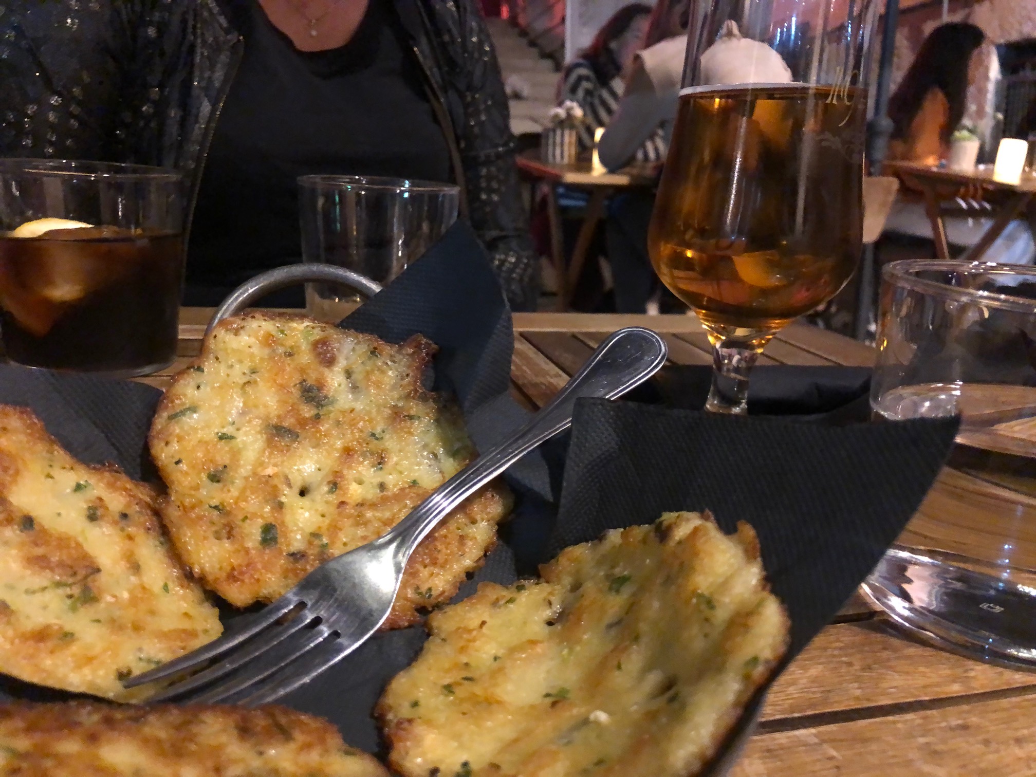 Og det var skønt, vi fik et bord, for det var lækker mad, der var fed stemning og god betjening. Og så nåede jeg lige endnu en af mine punkter nemlig at få torsk, som portugiserne virkelig går op i. Du finder nærmest ikke en restaurant uden 'bacalhau' på menuen. Jeg måtte dog nøjes med nogle flade fiskekager, men de var nu også ret go'e: