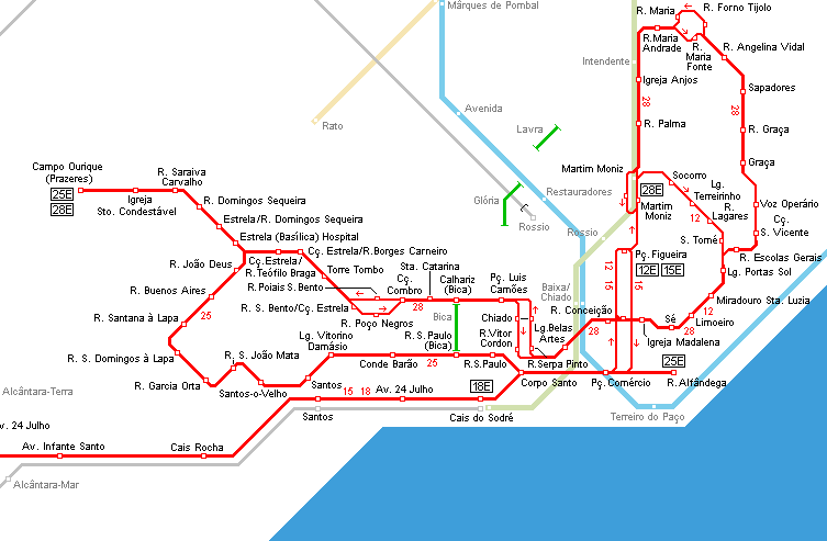 Ruten forbinder pladsen Martim Moniz med Campo Ourique og passerer gennem de populære turistområder Graça, Alfama, Baixa og Estrela.
