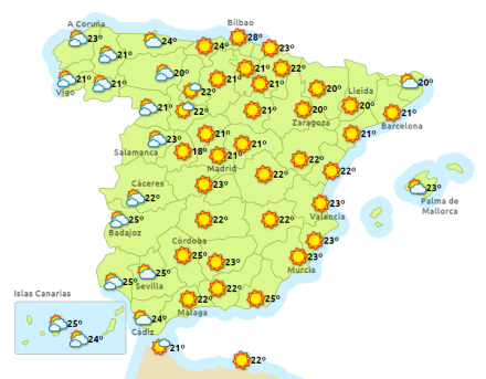 Madrid har kunne stå op til solskin fra en skyfri himmel og såden fortsætter det i hovedstaden i mange timer endnu. Først hen på aftentimerne kan der komme er par skyer over byen. De kommer dog tilpas sent, til at de ikke vil stå meget i vejen for solen. Temperaturen bliver 11 til 23 grader.
