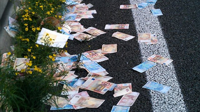 Da politiet skulle identificere bilens passagerer, bemærkede en betjent, at en af passagererne forsøgte at skjule noget inde under sit tøj. Da manden blev bedt om at identificere sig, smed han en stor konvolut ud af vinduet. Konvolutten indeholdt 11.900 falske eurosedler fordelt på 119 ethundrede-sedler.