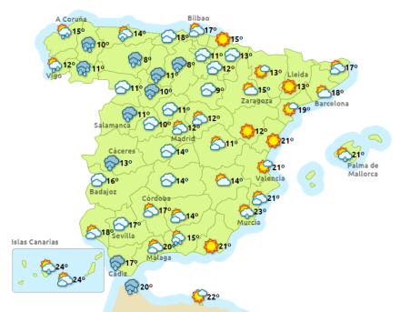 I Cantabrien, i højtliggende områder ud til Atlanterhavet og i Pyrenæerne er himlen overskyet og der kommer regnbyger af og til, som kan sprede sig til tilstødende områder. Dog går Middelhavsområdet fri, hvor stort set klar himmel dominerer hele dagen.