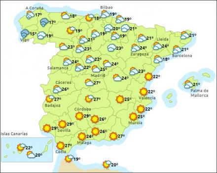 Madrid har i dag sol og nogen dis med mellem 13 – 29 grader, Barcelona får en del sol og mellem 14 – 22 grader, Valencia letskyet og 15 – 26 og endelig bliver Málaga badet godt og grundigt i sol og får mellem 17 – 28 grader.