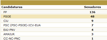 Det socialistiske regeringsparti står tilbage som valget store taber. Partiet får 110 mandater i Kongressen, en tilbagegang på 59 og det værste valgresultat i Spaniens historie.