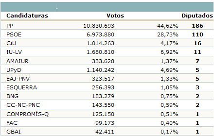 Det blev den forventede jordskredssejr til det konservative parti, PP og dets leder Mariano Rajoy. Kun to provinser er forblevet røde, og det er Sevilla og Barcelona. Men valget blev også vundet af de små partier.