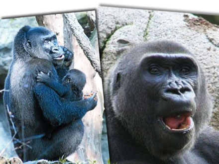 Til venstre ses Virunga sidde med sin datter, Ntua på armen