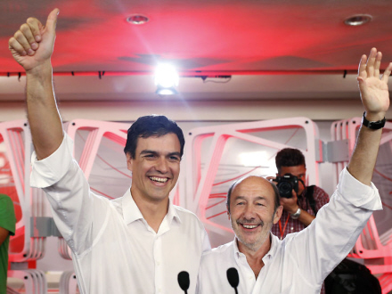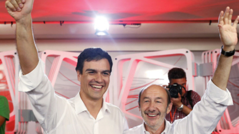 Pedro Sánchez til venstre, Alfredo Pérez Rubalcaba til højre - se videoen fra sejrsceremonien