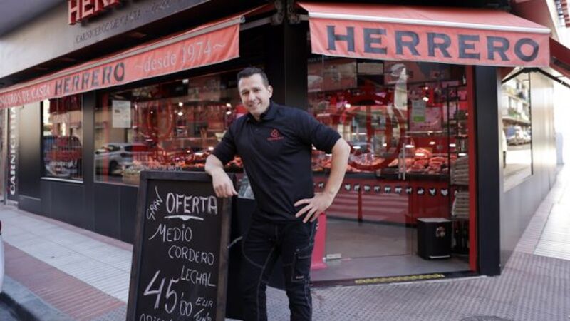 Ved indgangen til slagterforretningen Herrero er der et skilt med et saftigt tilbud: halvt lammelår for 45 euro.