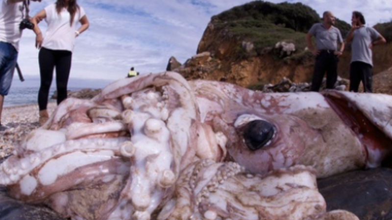 Se video af stranden med den store blæksprutte