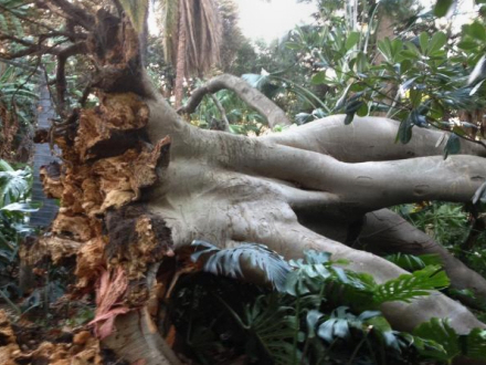 Ficus'en blev med tiden et imponerende træ, som dækkede hele området mellem det gamle palæ og lysthuset. Da giganten blev væltet i weekenden, skete der omfattende skader på andre træer og planter i haven. En meget sjældent udgave af en palme, Archontophoenix cunningamiana, som var den eneste af sin slags, der groede udendørs i Europa, blev helt smadret, da den blev ramt af det gamle kæmpetræ.