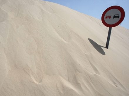 Den lille landevej, A-2325, som fører gennem det forblæste kystområde ved Punta Paloma, er igen sandet til. Lige så snart det blæser op fra øst, fyger sandet ind over skrænten - og nu er den altså gal igen.