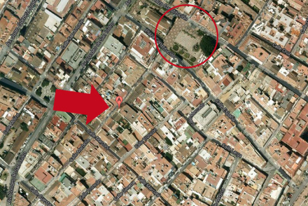 Pil: Hostal Galán, cirkel: Kirkepladsen/Plaza de la Constitución