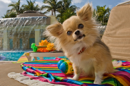 Ren luksus og masser af udendørs aktiviteter, en kæmpe swimmingpool på 1.500 m2 omgivet af palmer og skov, cykling og ridning, et fitness-center, spa på 800 m2, og - ja - så kan man selvfølgelig gå tur med sin darling. Pris for at medbringe en firbenet gæst: 37 euro.